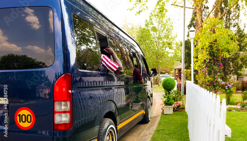 © Sunshine Seeds, Fototapeta premium Minibus taxi van parked outside a house in a wealthy neighbourhood