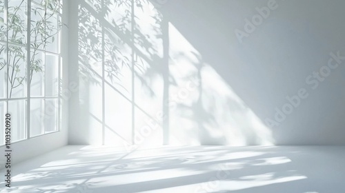 Fototapeta premium Minimal abstract light gray background for product presentation. Soft shadow and light from windows on white wall.
