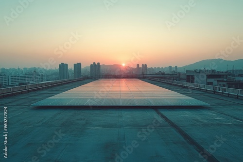 © Benjawan, Fototapeta premium Minimal AI-driven solar panel array on a rooftop, soft morning light, abundant empty space for text or design, copy space for stock photo with minimal concept, No logo, No Trademark, No text