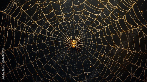 © Kenny Parker, Obraz premium Minimal black background emphasizing a golden spider's delicate web creation