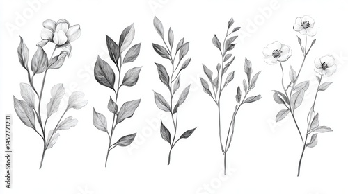 © Johannes, Naklejka premium Minimal botanical wedding frame elements on white background. Set of wreath, flowers, leaf branches in hand drawn pattern. Foliage line art design for wedding, card, invitation, greeting, logo. illus