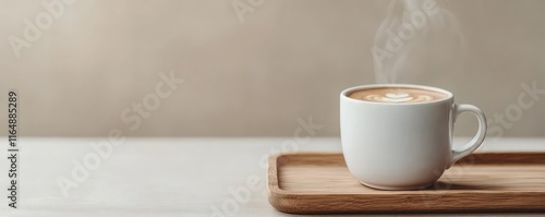 © Jiraporn, Obraz premium Minimal coffee concept. A steaming cup of coffee on a wooden tray, perfect for a cozy morning vibe.