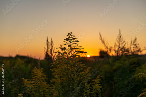 © Volha, Obraz premium Minimal composition of goldenrod inflorescences against a clean gradient sky and low sun. Calm, spacious background suitable for wellness, ecology, seasonal and inspirational messaging.