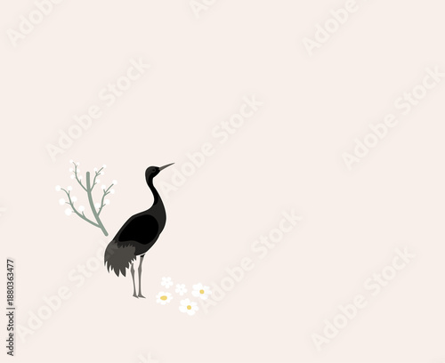 © INGWON, Obraz premium Minimal Crane Illustration with Soft Spring Flowers and Branches in Gentle Pastel Mood