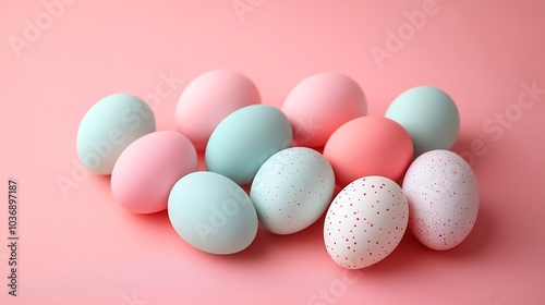 © GenZ_Pro, Fototapeta premium Minimal Easter decoration featuring set of monochromatic eggs arranged neatly on a plain pastel background The design is simple and elegant ideal for a modern Easter card or banner
