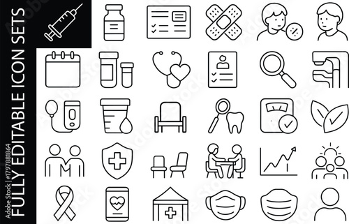 Fototapeta premium Minimal editable line icon set for medical vaccine, health checkup, clinic...