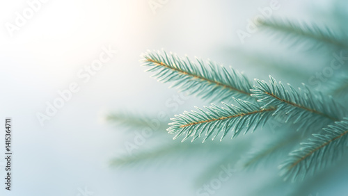 Fototapeta premium Minimal Fir Branch Close-Up With Soft Light And Frosty Tones For Winter...