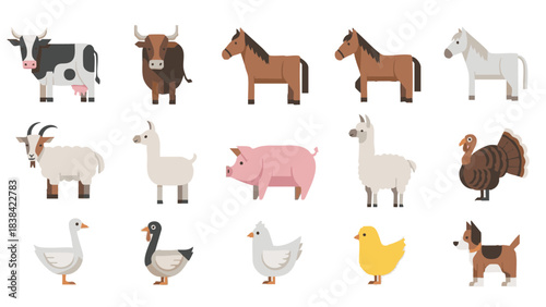 Obraz premium Minimal geometric flat vector set of 15 farm animals including cow, bull, horse, sheep, goat, pig, llama, alpaca, turkey, goose, duck, hen, chick and dog, isolated on white background
