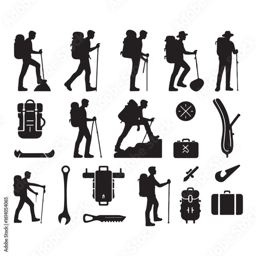 Obraz premium Minimal Hiking Man & Outdoor Gear Vector Set