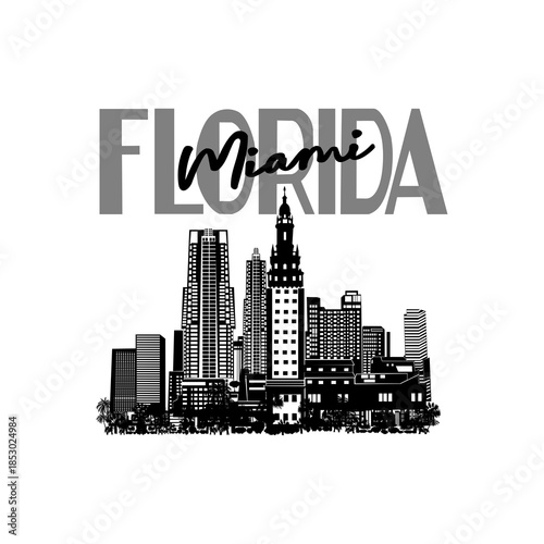 © Ning, Naklejka premium Minimal line art illustration of iconic Miami landmarks with palm trees and Art Deco style, capturing a modern tropical beach vibe. Ideal for t-shirts, posters, branding, and travel designs.