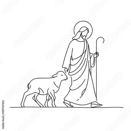 © JetHuynh, Fototapeta premium Minimal line art vector-style image of Jesus christ walking with a lamb