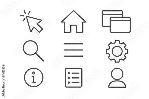 © Marie, Fototapeta premium Minimal Line Web and App UI Icons Set. Cursor, Home, Cards, Search, Info, User, Settings. Editable Thin Stroke Conceptual Vector Design for Websites, Mobile Applications, Interface Elements.