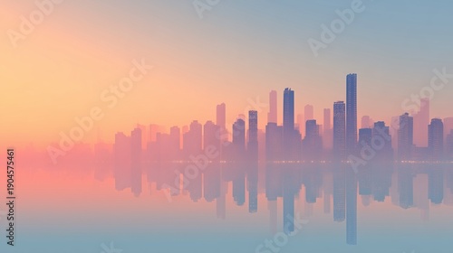 Fototapeta premium Minimal modern city skyline reflected on water at sunset