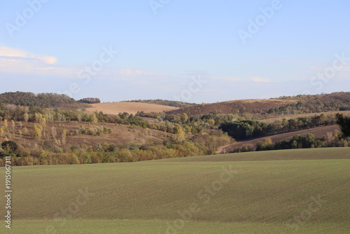 © RawProduct, Obraz premium Minimal rolling green fields with distant hills under clear sky