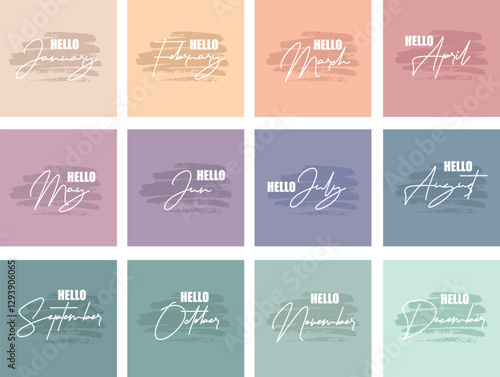 © gulsenbozkurt, Fototapeta premium Minimal soft color Handwritten months names of the year on the background of an colorful brush. Set of colorful month names. Vector, illustration.