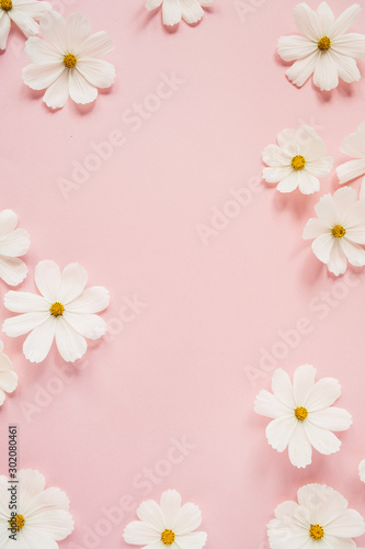 © Floral Deco, Fototapeta premium Minimal styled concept. White daisy chamomile flowers on pale pink background. Creative lifestyle, summer, spring concept. Copy space, flat lay, top view.
