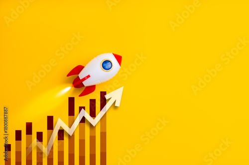© tete_escape, Fototapeta premium Minimal toy rocket launching over rising bar graph with growing arrow. Concept of business growth, startup success, scaling strategy, financial increase, innovation, and performance acceleration.