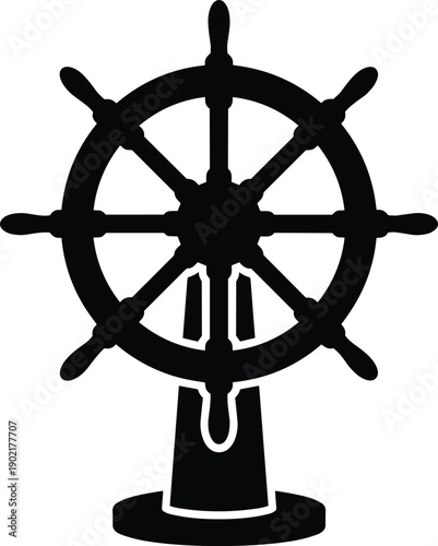 Obraz premium Minimal vector silhouette, nautical ship’s wheel mounted on a small stand,...
