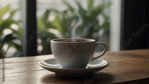 © João Salgado, Obraz premium minimal white coffee cup on rustic wooden table with soft natural morning light from nearby window