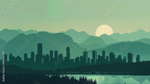 Obraz premium Minimalism illustration, silhouette of the Vancouver cityscape with Stanley Park and North Shore Mountains, flat illustration on pastel green background, empty copy space, lofi style illustration