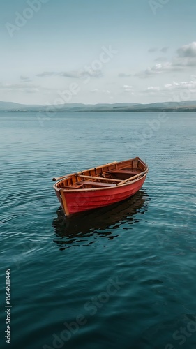 © A - Z, Naklejka premium Minimalist Aerial View of Red Wooden Rowboat Floating in Calm Deep Blue Water with Gentle Ripples