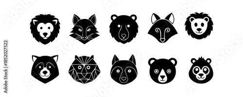 Obraz premium Minimalist Animal Face Icon Set – Black Wildlife Logo Symbols Vector