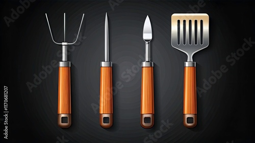Fototapeta premium Minimalist Barbecue Grill Tools Set Vector Illustration for Restaurant Menu and Butcher Shop Branding on Black Background