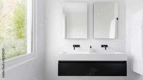 Obraz premium Minimalist bathroom with large mirrors and simple black fixtures, minimalist...