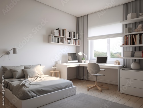Fototapeta premium Minimalist bedroom interior design with white bed, desk, and shelves.