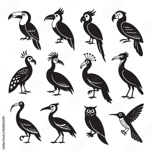 Naklejka premium Minimalist Bird Silhouettes Collection – Clean Black Shapes of Diverse Bird Species, Art & Illustration