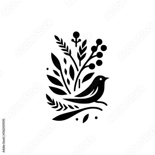 Fototapeta premium Minimalist Black and White Illustration of a Bird Perched Amidst Foliage,...