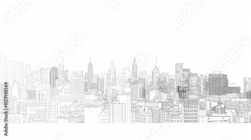 Naklejka premium Minimalist black and white line drawing of a city skyline, showcasing iconic...