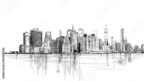 Naklejka premium Minimalist black and white line drawing of a city skyline, showcasing iconic...