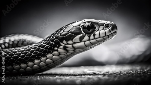 © Man888, Obraz premium Minimalist Black and White Snake Photography: Elegant Reptile in Simple Setting