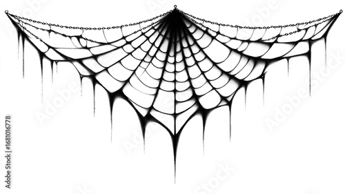 Fototapeta premium Minimalist black and white spider web line drawing with hanging silk clip art...