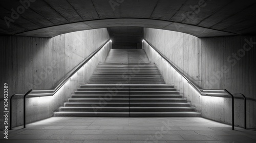 © Sana, Fototapeta premium Minimalist Black and White Staircase with Futuristic Lighting in Concrete Tunnel
