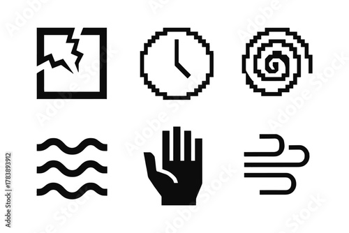 Obraz premium Minimalist black and white symbols: earthquake, time, spiral, waves, hand, wind