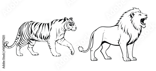 Naklejka premium Minimalist Black and White Vector of Tiger and Lion Walking Together