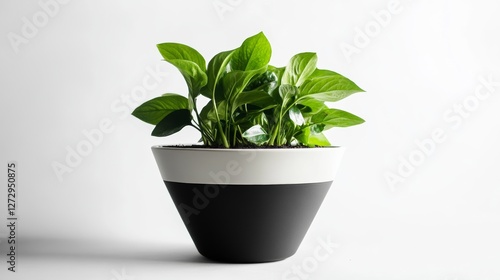 © Nica, Obraz premium Minimalist black cone matt white planter with plants in it, on a white background, no shadow - greens inside