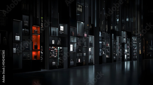 © Siasart Studio, Fototapeta premium Minimalist Black Display Cases with Bags and Products in a Modern Retail Store