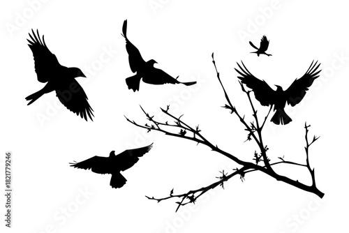 © zalal, Obraz premium Minimalist black silhouette of birds in flight flying