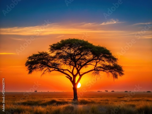 © Sunee, Obraz premium Minimalist Botswana Sunset: Silhouette of African Tree