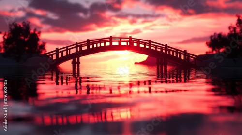 © Suresh Thangavel, Naklejka premium Minimalist bridge silhouette over calm waters at sunset.