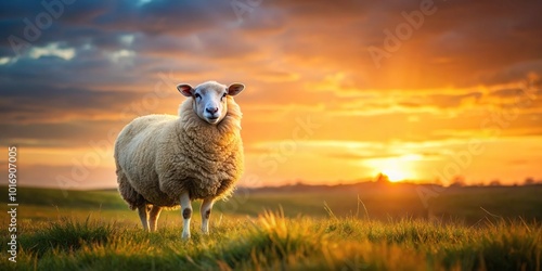 © Sayfar, Fototapeta premium Minimalist brown sheep, white sheep, field, sunset