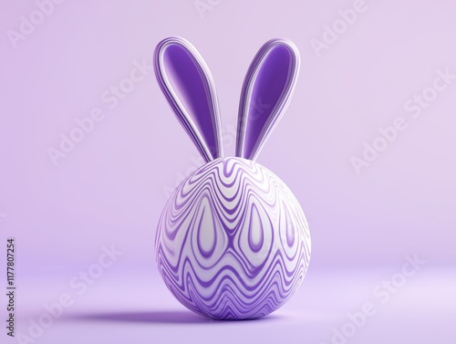 Fototapeta premium Minimalist bunny icon emerging from a patterned Easter egg in soft purple tones.