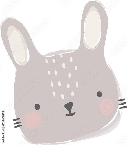 © vectorfusionart, Fototapeta premium Minimalist cartoon bunny head is being shown on transparent background, pastel gray off-white ears