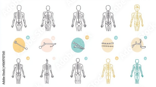 © Chaikit, Fototapeta premium 2410_056.minimalist chiropractic icon set, thin line drawings, simple human figures, spine diagrams, pastel color accents, white background, medical illustration style, editable stroke design,