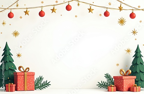Naklejka premium Minimalist Christmas border with red gifts green trees gold stars. Festive holiday background with copy space for text. Celebration season winter greeting card art.