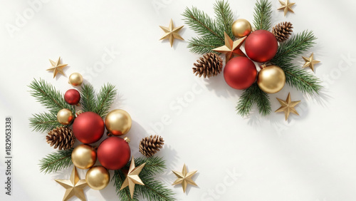 © Designbrisa, Fototapeta premium Minimalist Christmas Flatlay Background with Red and Gold Ornaments, Stars, and Pine Branches on White with Copy Space