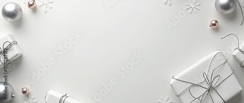 Fototapeta premium Minimalist Christmas Gifts Wrapped in Matte White Paper with Silver Strings